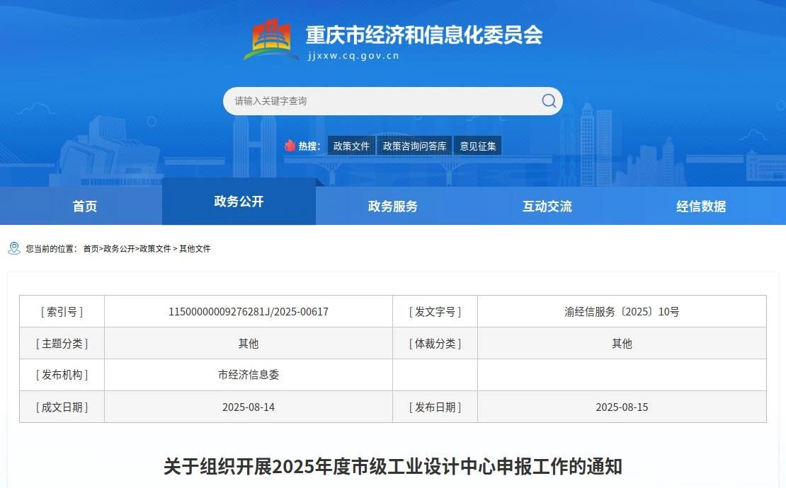 渝经信服务〔2025〕10号 重庆市经济和信息化委员会关于组织开展2025年度市级工业设计中心申报工作的通知 各区县(自治县)经济信息委,两江新区、西部科学城重详细内容...... -